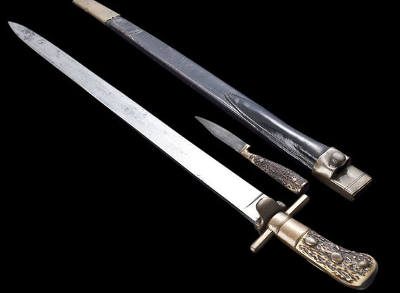 seltenes komplettes Stück mit Scheide und zugehörigem Beimesser, Griff mit Hirschhornplatten und Ziernieten.